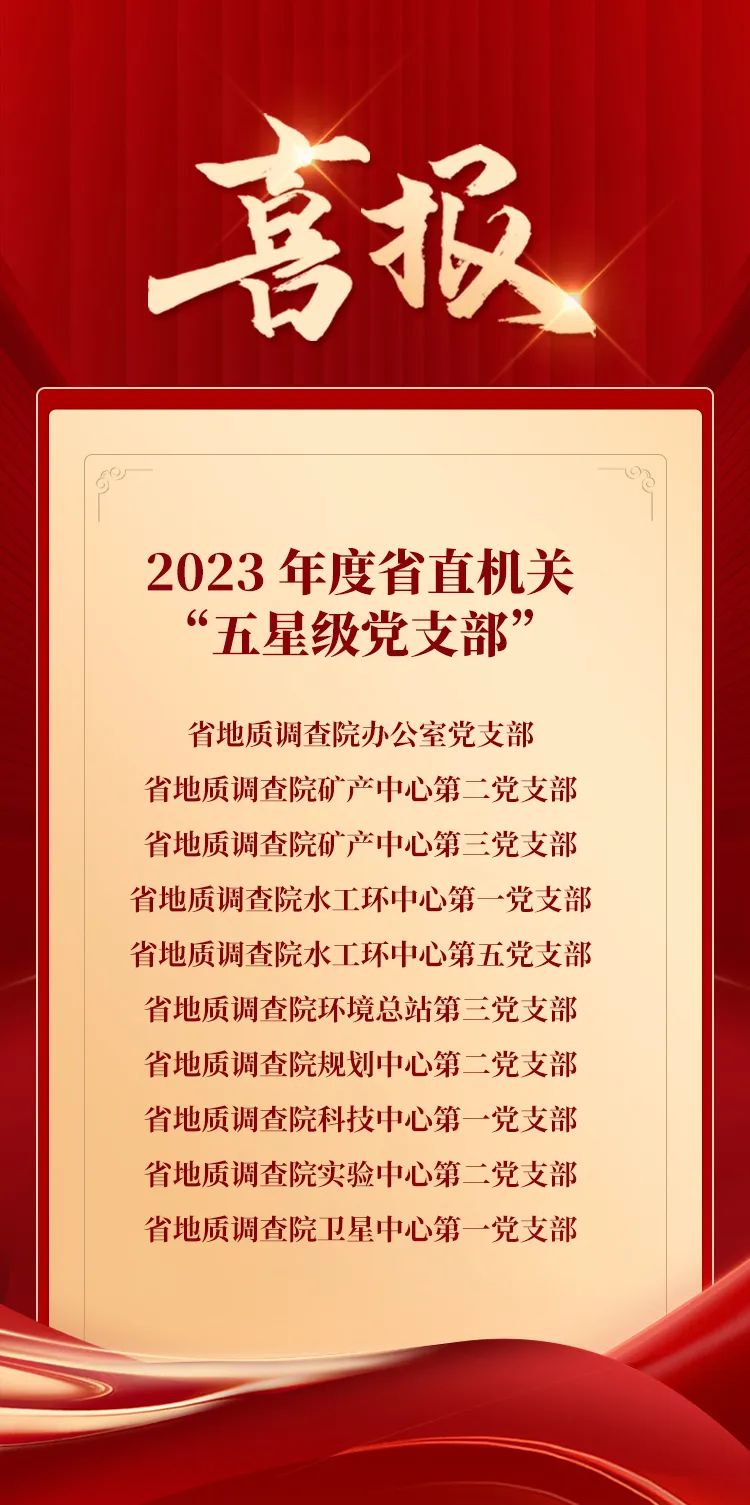 近日,陕西省委省直属机关工委印发《关于命名2023年度省直机关“五星级党支部”的通报》,陕西省地质调查院10个党支部被命名为2023年度省直机关“五星级党支部”。