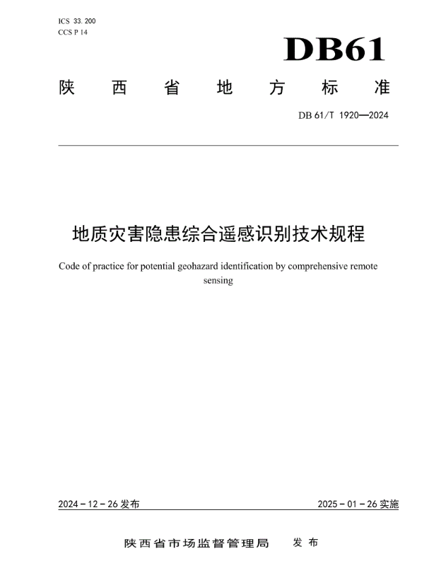 近日,由陕西省地质调查院卫星中心编制的《地质灾害隐患综合遥感识别技术规程》(DB61/T 1920-2024)经陕西省市场监督管理局审查批准,作为省级地方标准正式发布实施。