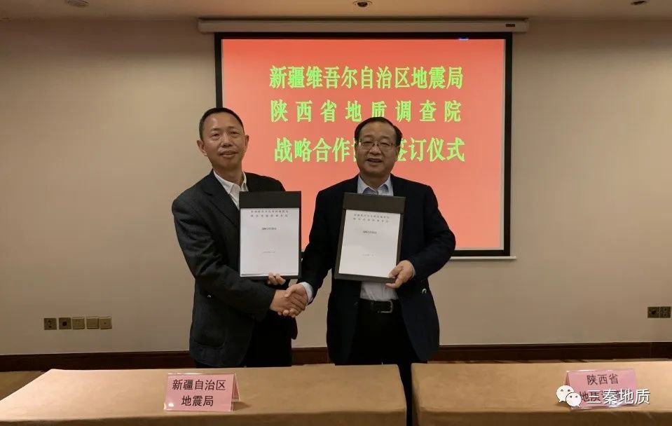 2023年1月8日,陕西省地质调查院与新疆维吾尔自治区地震局战略合作协议签订仪式在北京举行。双方就建立卫星遥感信息资源共享和应急联动机制,在卫星遥感、活动构造、地质大数据、人工智能等业务领域开展务实合作,共同开展上合组织成员国及“一带一路”沿线国家活动断裂研究、地质灾害隐患识别等领域研究和技术合作签署了战略合作协议。陕西省地质调查院党委书记洪增林、新疆维吾尔自治区地震局党组书记、局长吕志勇出席会议并代表双方单位签约。中国自然资源学会副理事长、执行秘书长沈镭,中国遥感应用协会常务副主任、秘书长卫征,陕西省地质调查院总工程师张晓团及相关部门负责同志参加。