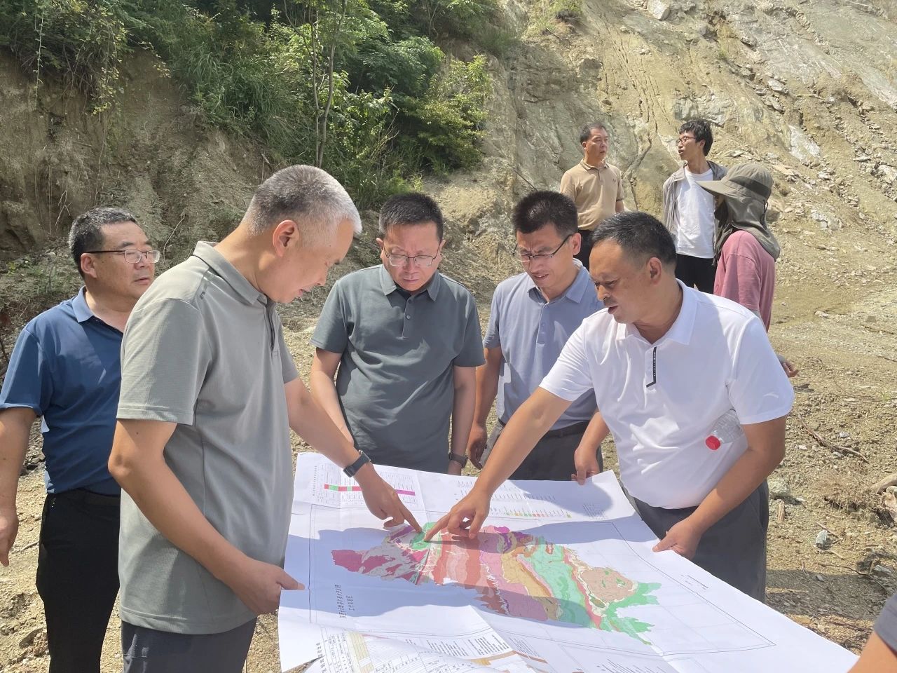 侯登峰一行先后到镇安县青铜关镇地质灾害风险调查评价、商南县矿泉水资源调查评价、关中盆地引汉济渭区域地下水动态监测评价项目现场,实地查看了2处地质灾害隐患点、2处泉水点和1处地下水位监测点的调查情况,在项目驻地听取了项目进展、安全保密、党建等相关工作情况汇报,查阅了项目原始资料、工作记录、会议记录等,就项目质量和进度、团队建设、安全生产、地质资料保密等方面提出了要求。
