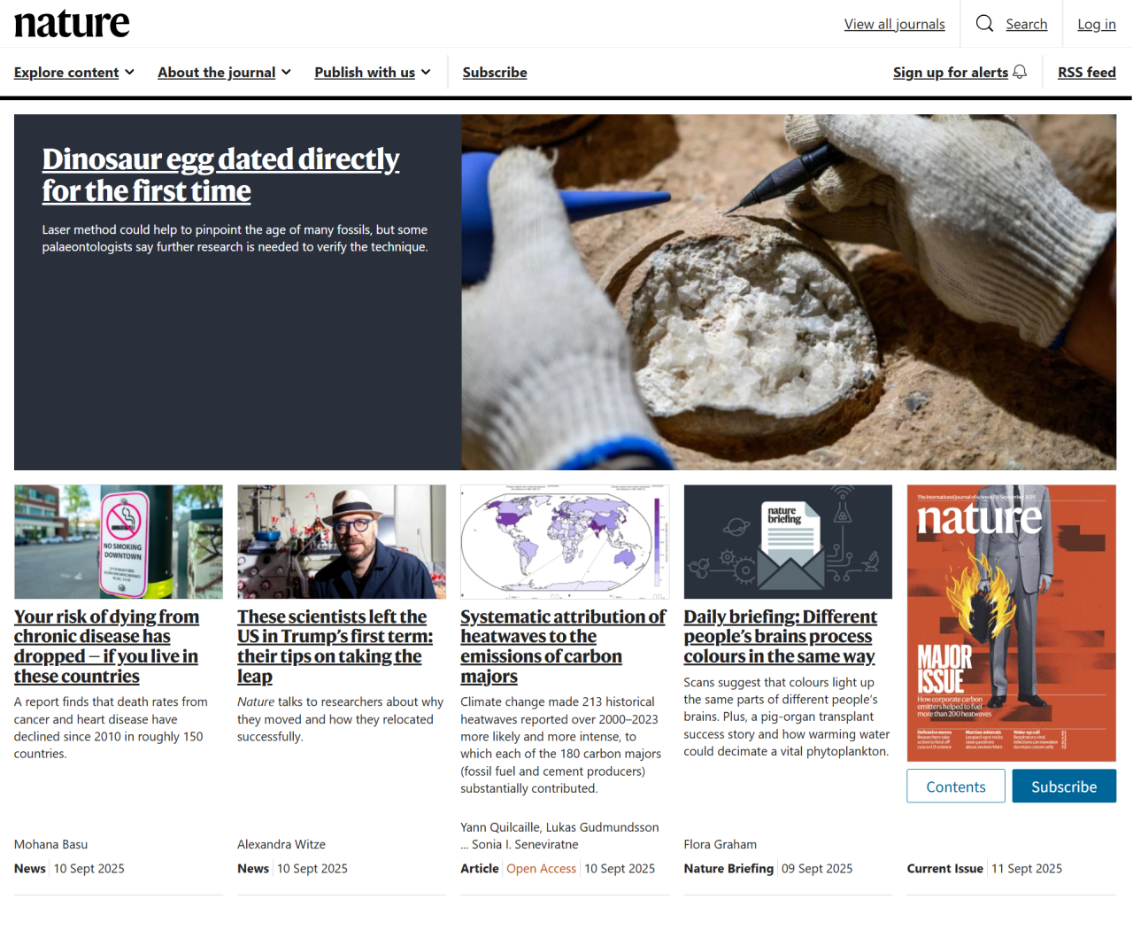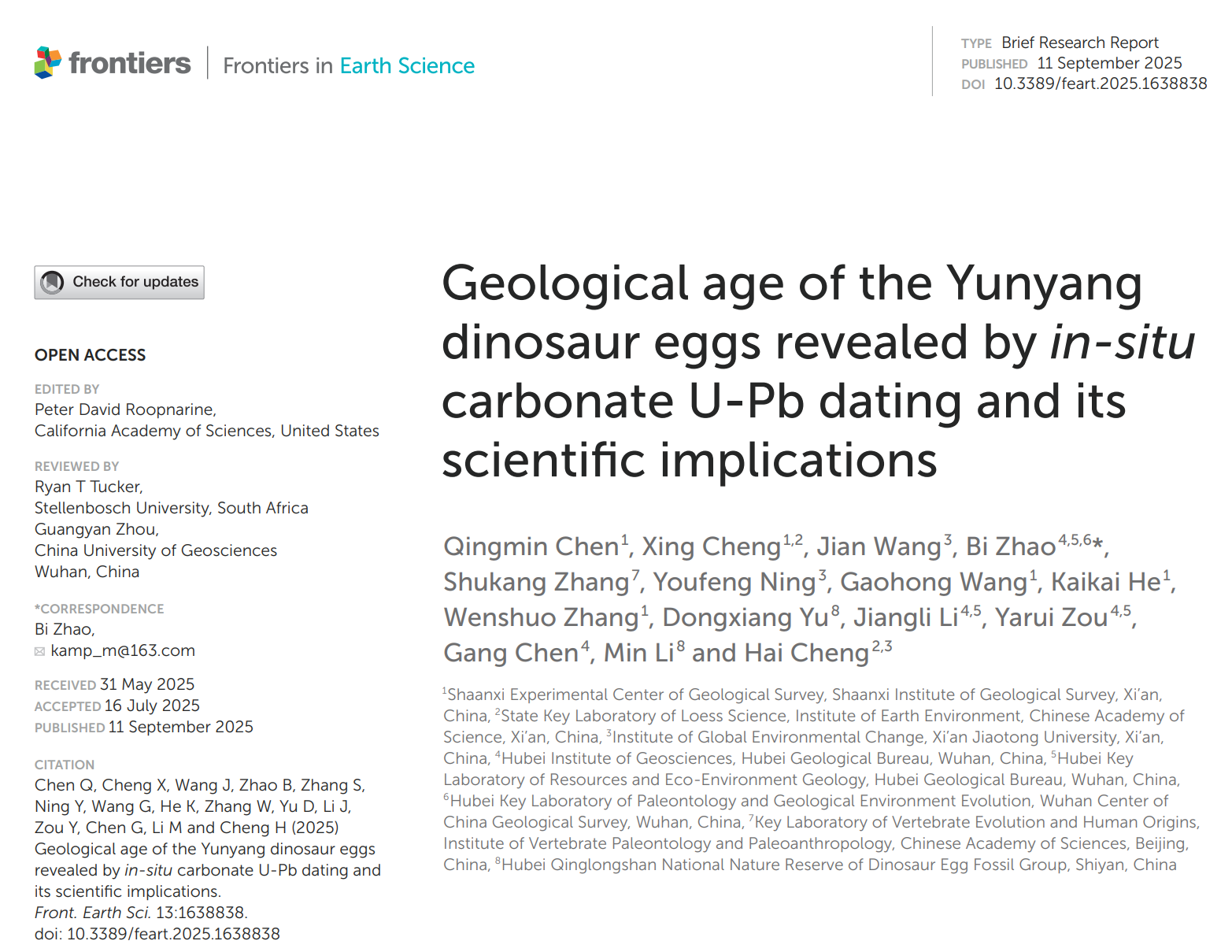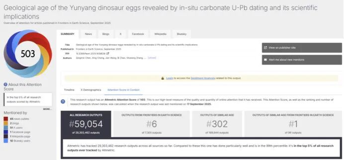 2025年9月11日,由我院实验中心总工程师陈清敏博士为第一作者、成星博士为第二作者发表的论文《Geological age of the Yunyang dinosaur eggs revealed by in-situ carbonate U-Pb dating and its scientific implications》(通过原位碳酸盐U-Pb测年揭示的郧阳恐龙蛋地质年代及其科学意义)在Frontiers in Earth Science(地球科学前沿)上发表,并被Frontiers集团选做热点新闻配文报道。 Nature(自然)官网以“首次对恐龙蛋直接测年”标题头版报道了此研究,并引起了Science(科学)等七十多家国际媒体跟踪(截至9月18日),国内新华社、央视网、光明网、湖北日报、十堰日报、十堰晚报等官方媒体也进行了相关报道。根据Altmetric Attention Score(全球关注度得分)统计结果,目前本研究社会影响力高达503,在Frontiers in Earth Science期刊历史上7305篇论文中排名第6,在全球历史上2930万篇论文中排名进入前6万名次(前千分之二)。