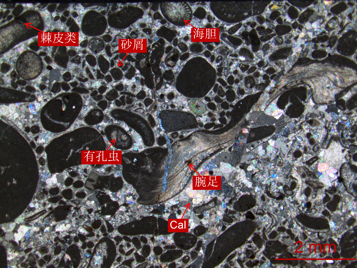 浅灰色亮晶生屑灰岩12.5x(正交偏光+)