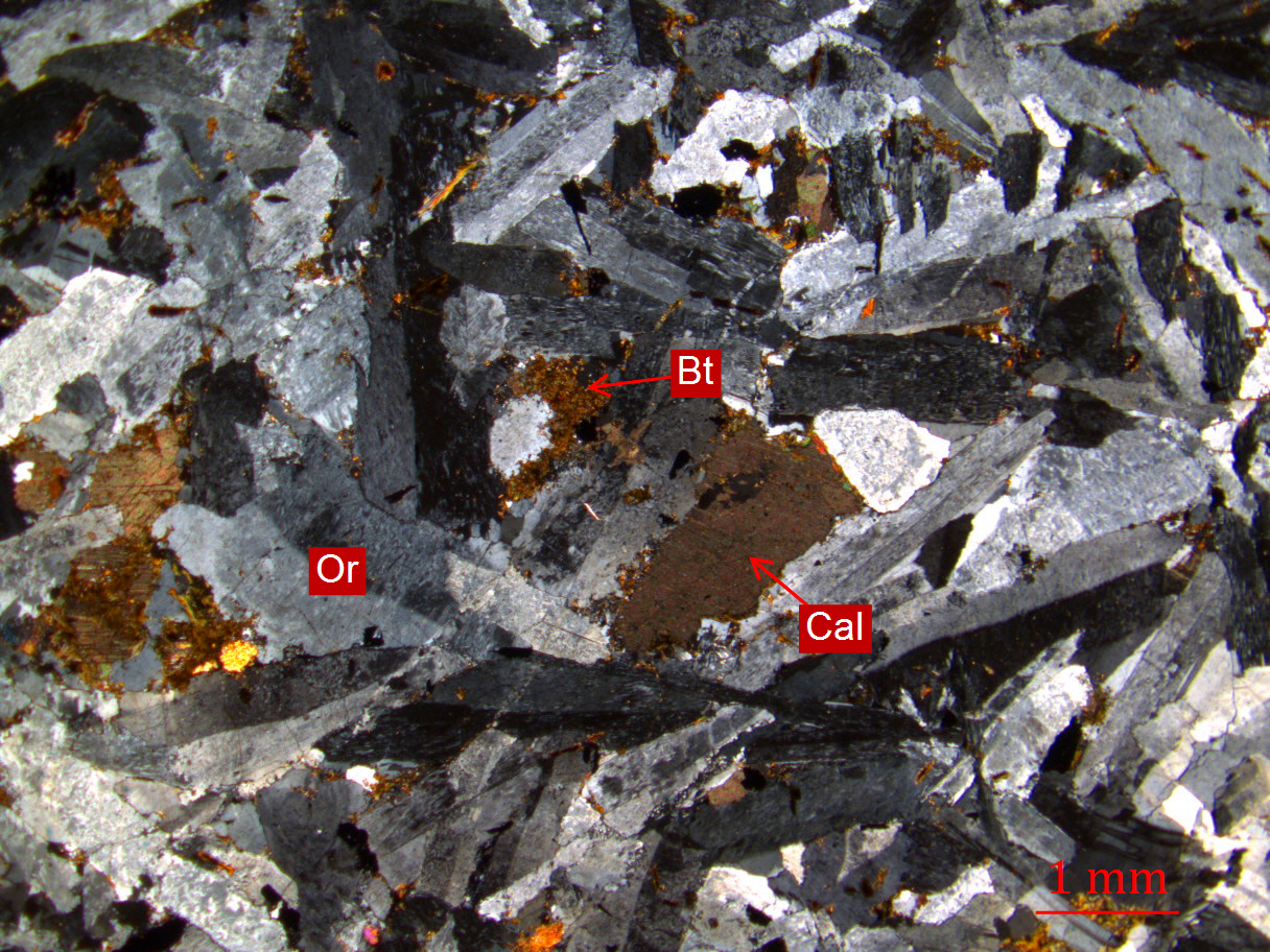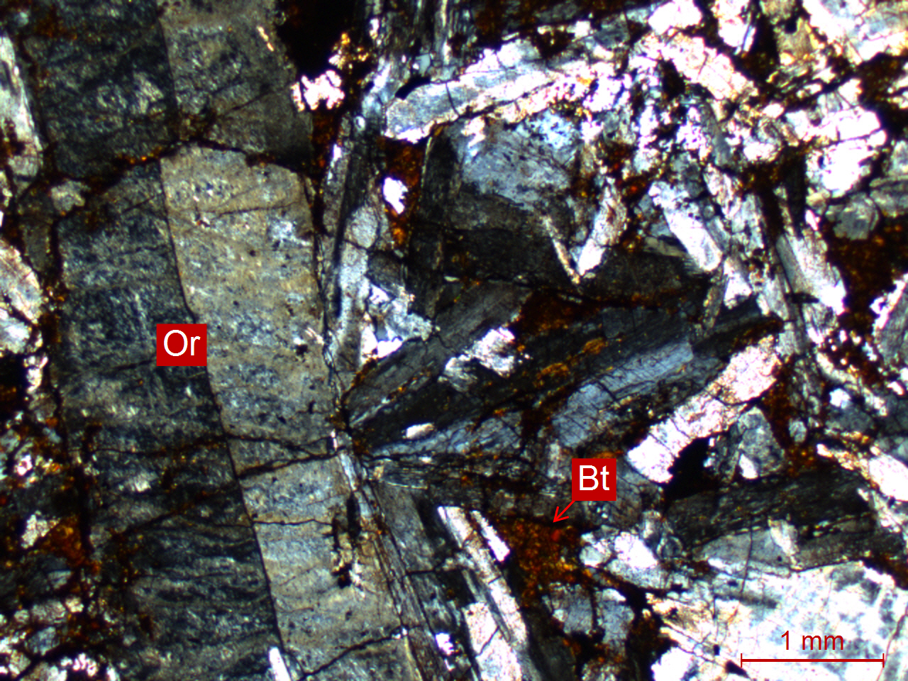 灰色蚀变黑云母正长岩25x(正交偏光+)