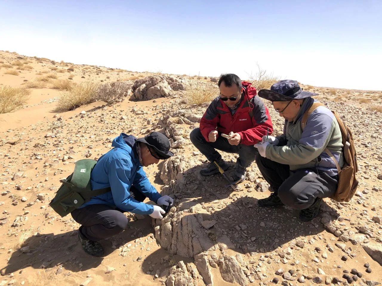 由于工区离驻地有几十公里,每天清晨,当第一缕阳光还未穿透厚厚的云层,团队成员们已经收拾好行装,登车出发。工区内大部分地区为沙漠戈壁区,车辆通行困难,团队成员们只能徒步前往,在调查时遇到陡峭的沙丘,需要手脚并用才能一步一步地爬上去,即使这样也没有阻挡他们前进的脚步。