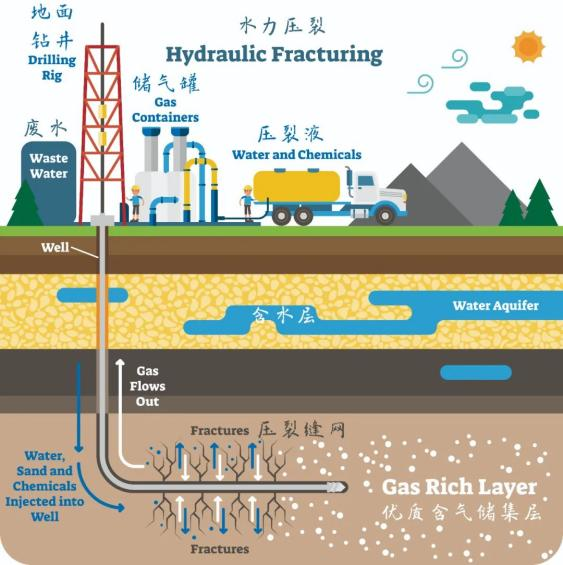 页岩的渗透率极低,在自然状态下无工业产能,在油气开发人员的钻研之下,通过向储层注射高压流体,人工制造缝网,来达到工业化开采的目的。目前开采主要采用水平井+水力技术和旋转导向技术。