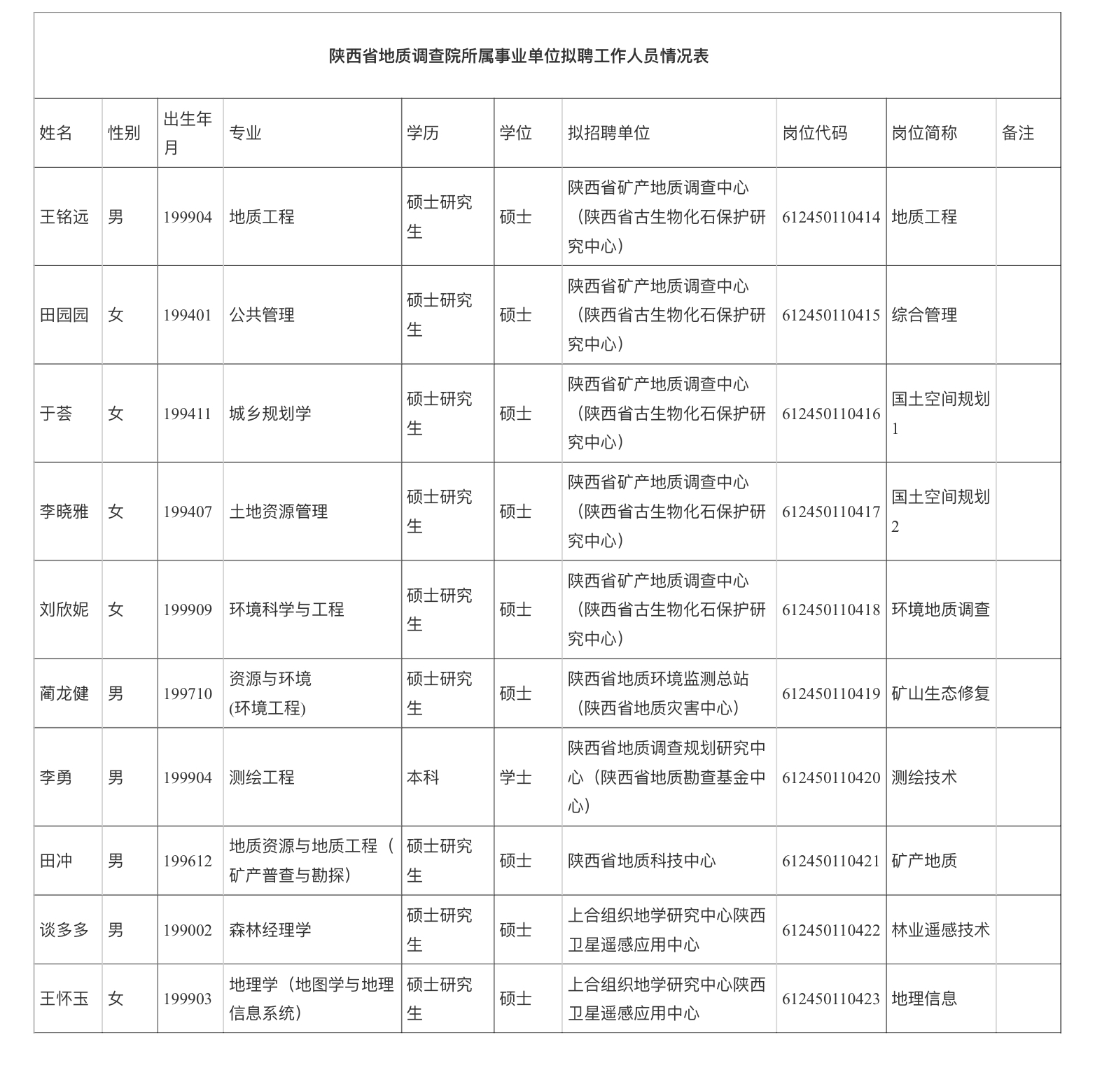 附件:陕西省地质调查院所属事业单位拟聘工作人员情况表