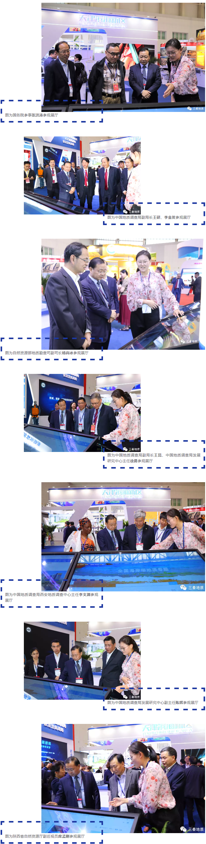 大会期间,天津市长张国清,自然资源部部长陆昊,副部长凌月明,中国地质调查局局长钟自然,国务院参事张洪涛,中国地质调查局副局长王研、李金发、李朋德、王昆,总工程师严光生,自然资源部地质勘查司副司长杨尚冰,中国地质调查局发展研究中心主任徐勇,中国地质调查局总工室主任吴登定,中国地质调查局发展研究中心副主任陈辉,陕西省自然资源厅厅长薛建兴、副巡视员席孟刚,国际地质科学联合会主席、中国地质大学成秋明教授等领导以及中外各界嘉宾来到展厅参观。陕西省地质调查院党委书记、院长洪增林介绍了“地质云·陕西”的建设成果并进行了现场演示。与会领导和专家对“地质云·陕西”给予了充分肯定,一致认为“地质云·陕西”数据资源丰富,技术领先,具有平台优势,应用前景十分广阔。