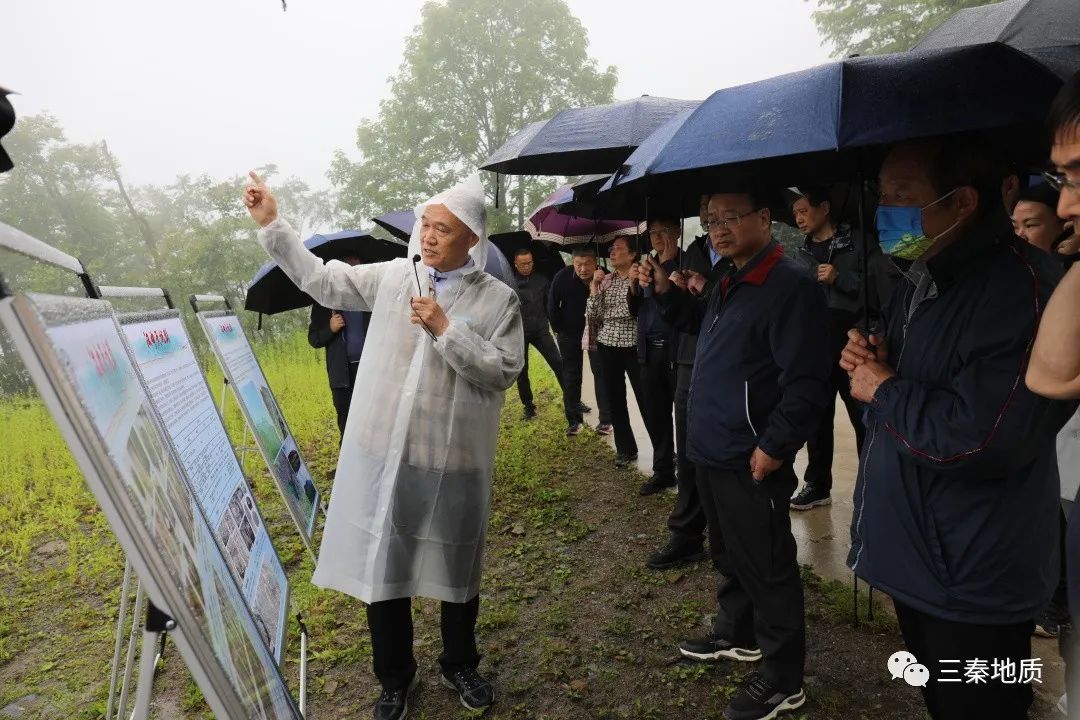 风又起,雨愈急。专家组来到双龙洞考察点,沿着泥泞湿滑的山路,踏着碎石一路向前,考察了双龙洞岩溶地下水长观站。在考察点科普讲解区,岩溶水和岩溶碳汇展板吸引了众多专家驻足讨论。专家认为,以汉中天坑群区域研究成果为基础,继续深化岩溶碳汇研究与开发利用,将会为全省“双碳”目标任务实现提供重要技术支撑,意义重大。