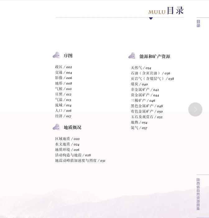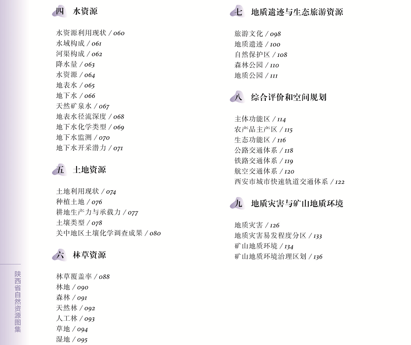 《图集》包括序图、地质概况、能源和矿产资源、水资源、土地资源、林草资源、地质遗迹与生态旅游资源、综合评价和空间规划、地质灾害与矿山地质环境等9大部分,共78份图件。系统梳理和总结了陕西省自然资源“家底”,深入盘点和记载了陕西省国土空间规划现状,客观反映和凸显了陕西自然资源在支撑服务经济社会发展中的重要作用,实现了成果资料的深度融合和高度集成,为社会公众提供了一套准确详实的科研读物和工具书,对支撑陕西自然资源管理、服务经济社会发展、推动教学科研和科学普及具有深远而重大的意义。