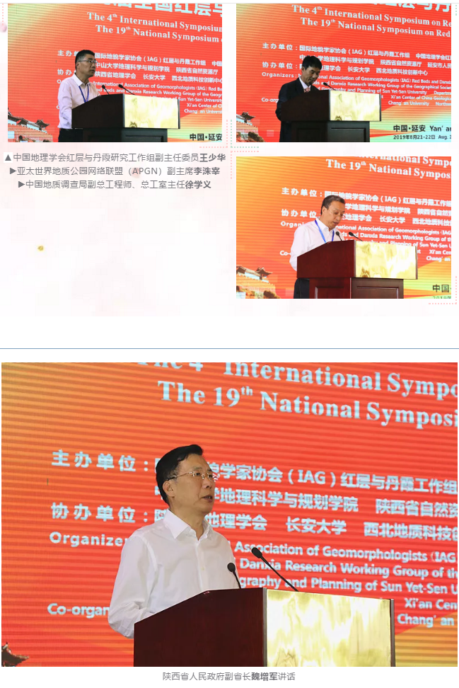 来自印度的国际地貌学家协会(IAG)副主席苏内尔·库马德、中国地理学会红层与丹霞研究工作组副主任委员王少华、来自韩国的亚太世界地质公园网络联盟(APGN)副主席李洙宰、中国地质调查局副总工程师、总工室主任徐学义、陕西省人民政府副省长魏增军先后讲话。