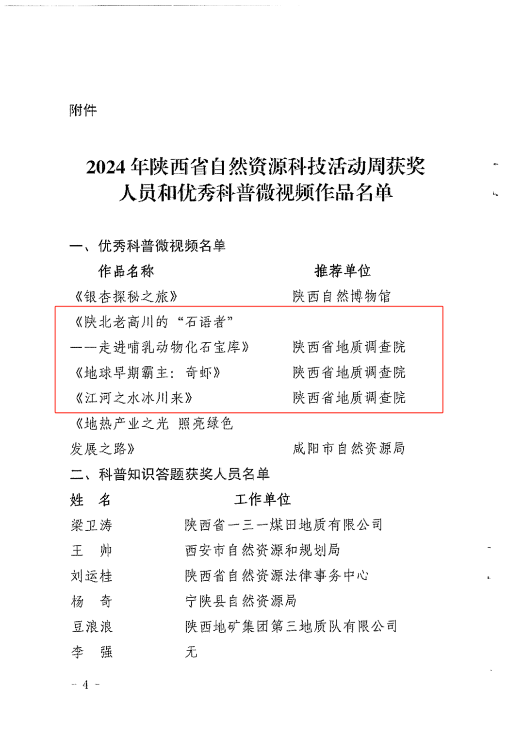 下一步,陕西省地质调查院将以此次获奖为契机,深入学习贯彻习近平总书记关于科技创新和科学普及工作的重要论述,认真落实陕西省《全民科学素质行动规划纲要(2021—2035年)》要求,以地球系统科学理论为指导,争取原创更多精品力作,不断推进自然资源科普工作高质量发展,为谱写陕西新篇、争做西部示范作出更大的贡献!