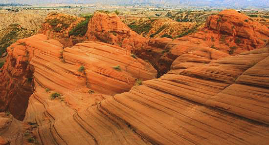 地层的形状千变万化,千姿百态。有的很平缓,整齐舒展,层峦叠嶂;有的曲曲折折,犹如一条条巨龙蜿蜒盘旋;有的直立挺拔且翻转,巍峨屹立,厚薄不等,分布在连绵起伏的崇山峻岭之间。