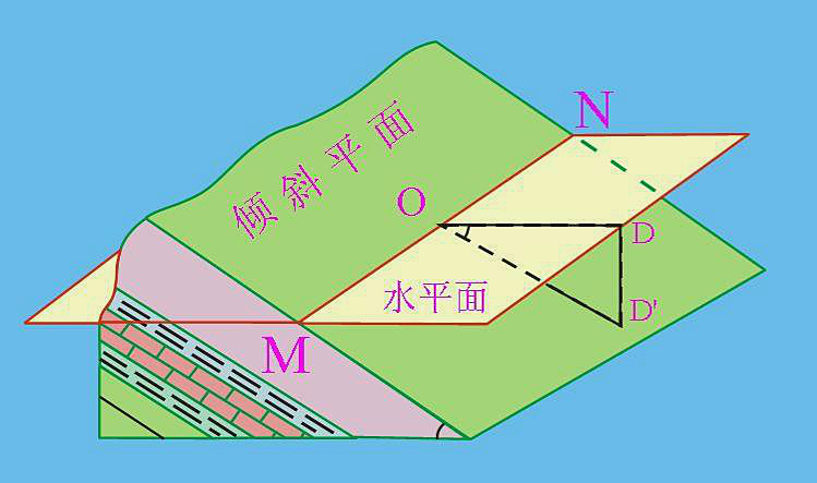 倾角:岩层的倾斜线与它在水平面上投影线之间的锐夹角就是该岩层的倾角。