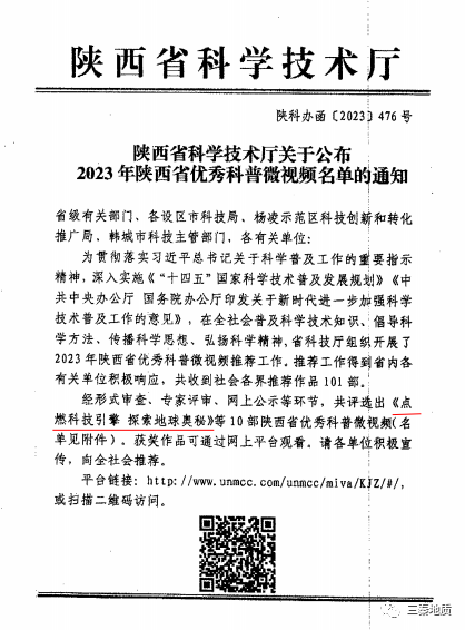 为贯彻落实习近平总书记关于科学普及工作的重要指示精神,在全社会普及科学技术知识、倡导科学方法、传播科学思想、弘扬科学精神,近日,陕西省科技厅组织开展了2023年陕西省优秀科普微视频推荐工作,由陕西省地质调查院制作的科普微视频《点燃科技引擎 探索地球奥秘》经形式审查、专家评审、网上公示等环节,最终从101部科普作品中脱颖而出,荣获“2023年陕西省优秀科普微视频”。