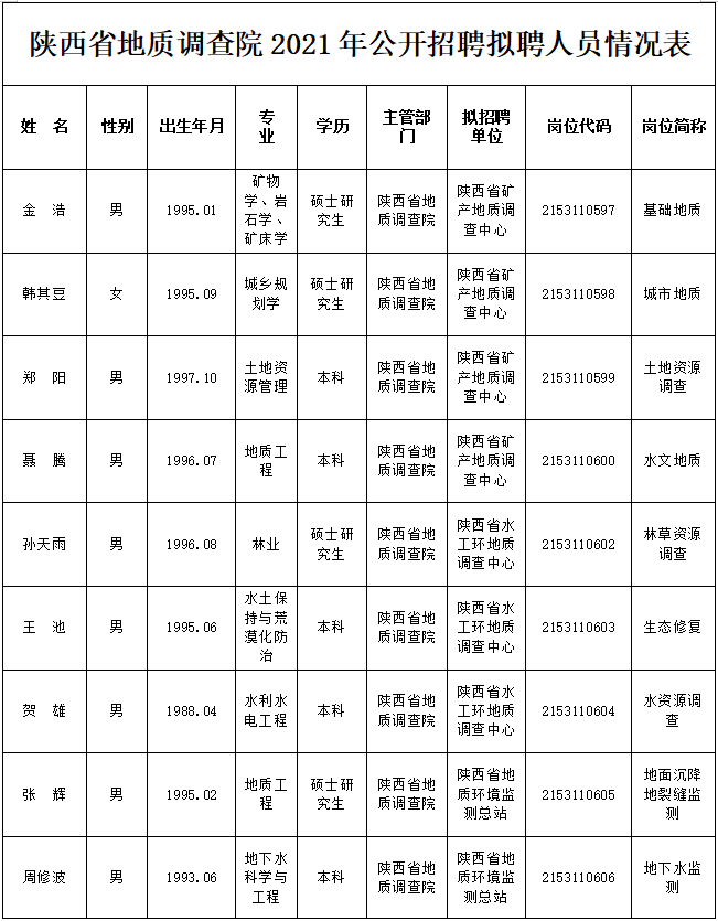 附件:陕西省地质调查院2021年公开招聘拟聘人员情况表