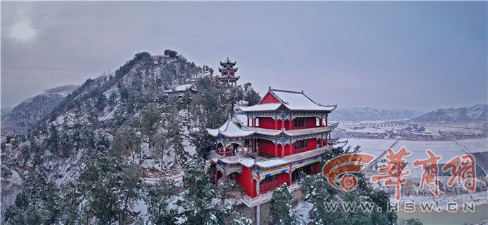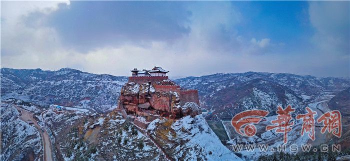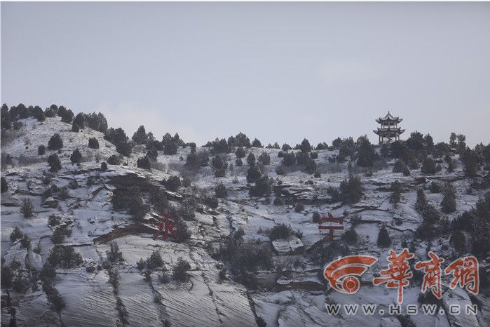 驻足观看,永宁山整个山体为红砂石质,峭崖绝壁,气势雄伟,洛河环抱着这座山峰。寒风乍起,惊得山坡树枝积雪满天飞舞,吹得科考人员难以站稳。