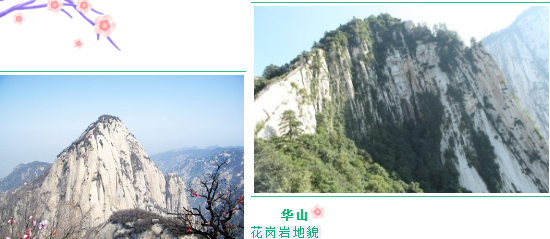 3.华山东西两侧河流下切和南北两个断层错动推波助澜,更使华山形成“太华之山,削成四方”的陡峻、峻险、雄伟的花岗岩地貌。