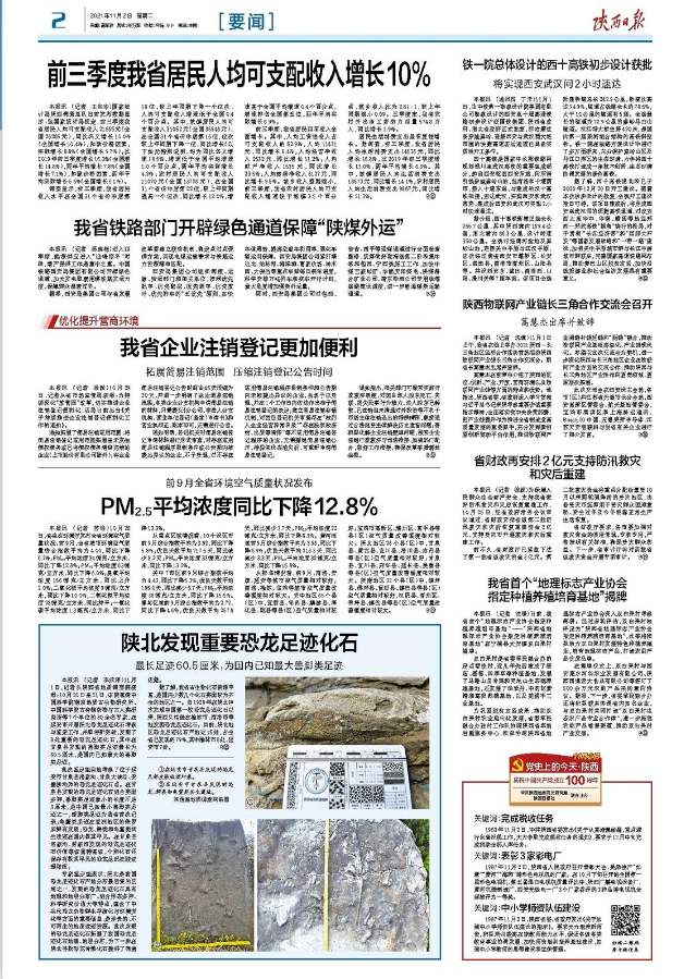 本报讯 (记者 李欣泽)11月1日,记者从陕西省地质调查院获悉:10月20日至21日,该院邀请中国科学院南京地质古生物研究所、中国科学院古脊椎动物与古人类研究所等7个单位的30余名专家,在延安市开展陕北恐龙足迹化石考察与鉴定工作,并取得新突破,发现了8处重要的恐龙足迹化石,其中在甘泉县发现的兽脚类足迹最长为60.5厘米,是国内已知最大的兽脚类足迹。