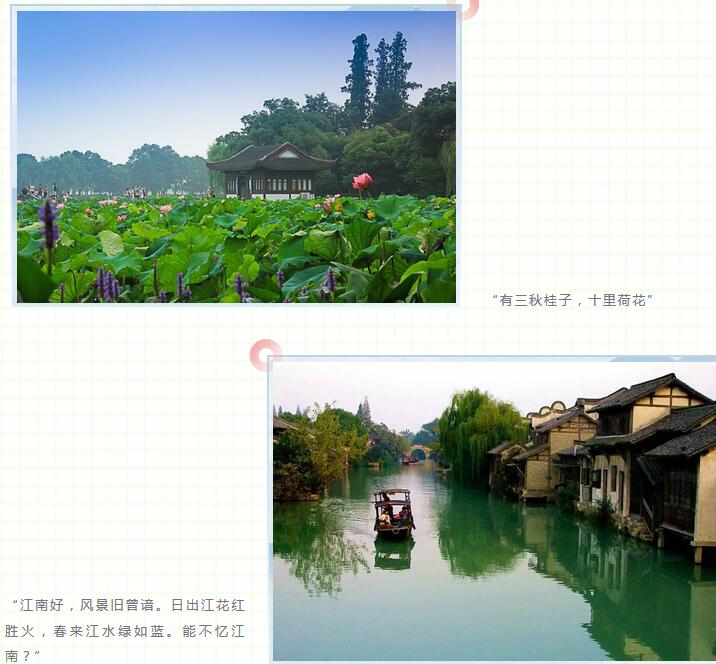 江南的山水总是热闹的,也是富有诗意的。比如“有三秋桂子,十里荷花”,因为词描写的意境过于优美,以至于金国国主完颜亮听闻此歌,欣然有慕,遂起投鞭渡江之志。再如白居易的《忆江南》“江南好,风景旧曾谙。日出江花红胜火,春来江水绿如蓝。能不忆江南?”诗人们总以丰富的想象和联想,在山、水等众多外在意象中营建起富含妙思和哲理的精神意趣。山水有了风情和生命,山水诗有了禅理,山水画有了意境,就连自然的山水风景也成了文人们流连忘返,难以割舍的双重意象。