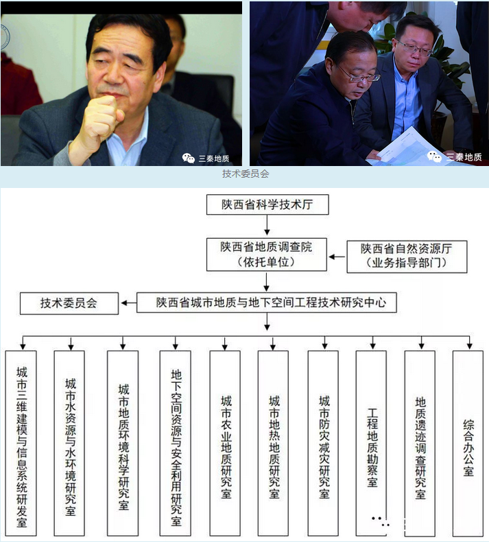 工程中心设主任1名,副主任2名,秘书长1名。聘请中国工程院王双明院士,陕西省地质调查院党委书记、院长洪增林教授分别担任技术委员会主任及第一副主任,与13名省内水工环地质、城市地质、地下工程及相关领域专家组成技术委员会。