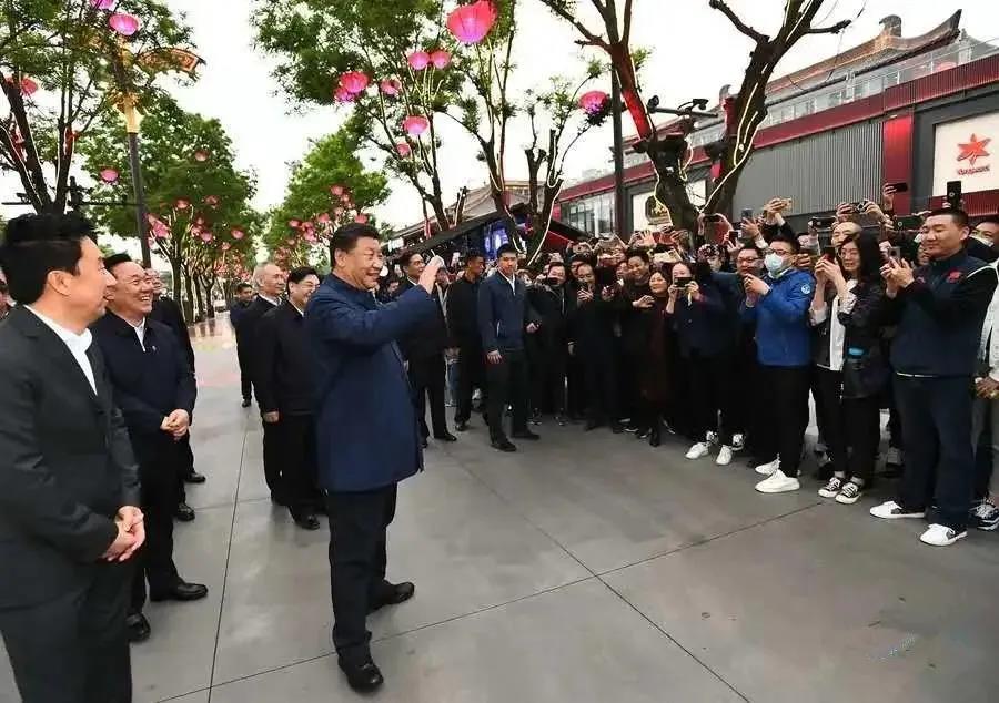 傍晚时分,习近平乘车来到毗邻大雁塔的大唐不夜城步行街。疫情发生以来,昔日熙熙攘攘的步行街一度空荡无人,现在又开始热闹起来。习近平走进步行街,了解步行街恢复经营状况。沿途游客看见总书记,惊喜地欢呼起来,习近平频频挥手致意。他走进老字号西安饭庄,同店员和正在就餐的顾客热情交谈。习近平强调,要在科学防控疫情的前提下,有序推动各类商场、市场复商复市,努力恢复正常生活秩序。