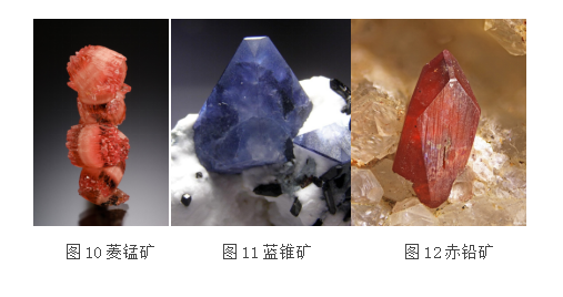 赤铅矿化学成分主要为铬酸铅,通常呈鲜艳的风信子红、橘红或橘色。发育完好的赤铅矿晶体呈长柱状,也呈锥状、板状单体,集合体呈晶簇状、块状、薄膜状等。具有金刚光泽,半透明,断口呈贝壳状至参差状。
