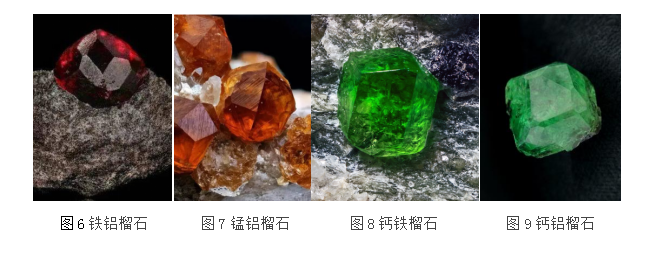 钙铁榴石也叫翠榴石(图8),主要含有铬元素,一般颜色呈现黄绿或翠绿色。钙铁榴石还有黄--绿黄色的黄榴石和黑色的黑榴石;翠榴石具有较强的折射率和光泽度。但其晶体一般不大,大于4克拉的优质翠榴石已属罕见。