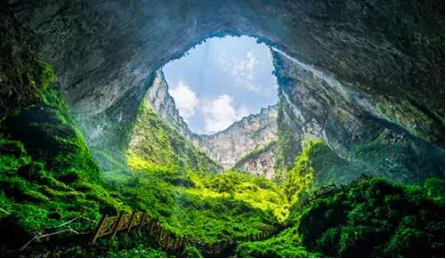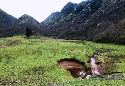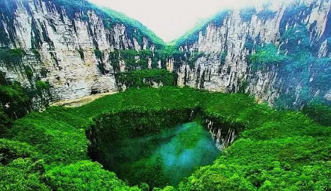 沿着泥泞的山间小道一路翻山越岭,藤蔓缠绕,蜿蜒曲行,植被茂密,静幽的原始森林自然风貌是天然氧吧,倍感惊奇。穿过万亩竹海,一路攀援上升,我们经过近二小时穿越,来到圈子崖脚下,眼前看见沿南北串珠状分布的草地、落水洞、洼地汇聚而成水塘里菖蒲青青,一群牛羊正在悠闲散步。眺望前方,云雾缭绕,阳光忽明忽暗,雄伟的圈子崖仿佛是一座 “仙山”。走进谷底,涓涓溪水潜流,仿佛觅不见踪影,细细探察均汇入落水洞,进入地下暗河系统中。考察完十余个落水洞与阶地地貌景观后,我们沿山脚继续向圈子崖进发,随着海拔渐高,树木越来越高大茂密,空气湿度增大,树干上挂满了尺长青苔,微风摇曳,如同南方榕树老人的一缕缕“胡须”,甚为有趣。一个多小时候艰难跋涉筋疲力尽后,终于来到了中国北方最大的世界超级天坑—圈子崖坑口。圈子崖天坑坑口形如“巨人脚掌”,口径最大处520米, 宽310米,最大深度380米,海拔最高处1939米,最低1735米,是屹今为止全球海拔最高的超级天坑,规模居全球第五。专家告诉我:这里的天坑是地表水通过对二叠纪石灰岩不断溶蚀,地表水经过裂隙逐渐汇聚,构成地下暗河系统,石灰岩进一步溶蚀,形成大型洞厅,在裂隙渗滤溶蚀与重力作用下,洞顶岩石垮塌并被地下水流搬运带走,才形成天坑,最后随着构造运动抬升,才形成了现在的圈子崖天坑地貌景观。圈子崖天坑位于原始森林无人区,植被茂繁,木竹满山,原始生态环境保存非常完好,是一处天然“超级大氧吧”。正午的阳光清澈明亮,照在崖壁上,悬崖峭壁雄伟壮观震撼,就像一只“巨型大桶”,容纳世间万物。从低缓坑边的一条小路顺势而下,崖壁树枝斜挂,阳光从天空映射到坑底,草木郁郁葱葱,格外青翠;乱石叠嶂,显得神秘而静幽。美丽的小花,静静地在谷底绽放,轻抚树上那些长满的松萝苔藓,感受岁月时光铅华。仰望天空,只见朵朵白云在湛蓝的天上飞舞,站在谷底随意的起跳,都能感受到地底的颤动与心跳。置身亚洲最大的万亩木竹林海,叹林海茫茫;穿越林罗城,怪石奇峰,仿佛群山绵绵无际到天涯;高山深处的岩溶湖—星月湖,宁静深邃,坐在湖畔,湖水幽蓝,碧空如镜,心静如水,洗净心灵污浊与滚滚红尘虚华。