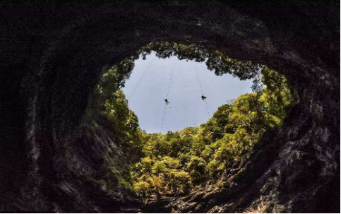 早上,细雨霏霏,我们与镇巴天坑办一起踏上了圈子崖的行程,首先来到最近的网红天坑—天悬天坑,天坑直径100米,深180米,从空中俯瞰呈现出美丽的心型,十分震撼。来到天坑口,四周树木茂盛,树根蛇盘曲绕,空气清新怡人。站在坑口俯看,坑壁陡崖深不可测。坑底水声轰鸣,令人惊叹大自然鬼斧神工。